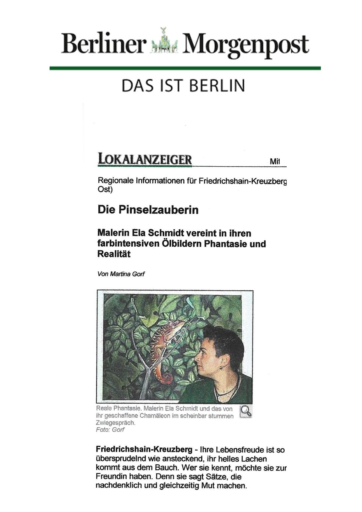 The Berlin Painter Ela Schmidt is mainly dedicated to realistic painting. Her art is inspired by her journey and encounters abroad and in her hometown Berlin. Her mainly used materials are acrylic paint and oil paint on canvas and mixing techniques.